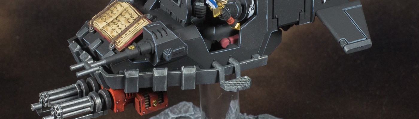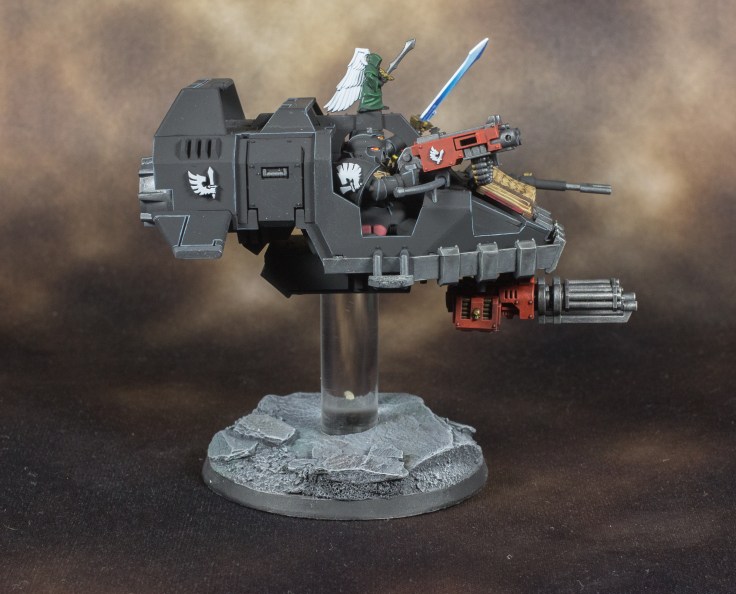 So now that I’ve realized the trap I had fallen into, I adjusted how I approached this model. First, I didn’t bother with airbrushing in highlights, edge highlighting with a desaturated pale blue would be enough to break up the monotony of the black armor along with just painting. Second I used less sub-assemblies then I would normally. Each marine torso, the twin heavy bolter, and the twin assault cannon were the only separate pieces. Also, I went kind of quick and dirty with the washes and edge highlighting. Meaning I didn’t take a painstaking amount of time to carefully highlight every edge or with every wash application. If mistakes happen they can be cleaned up right away or fixed later.