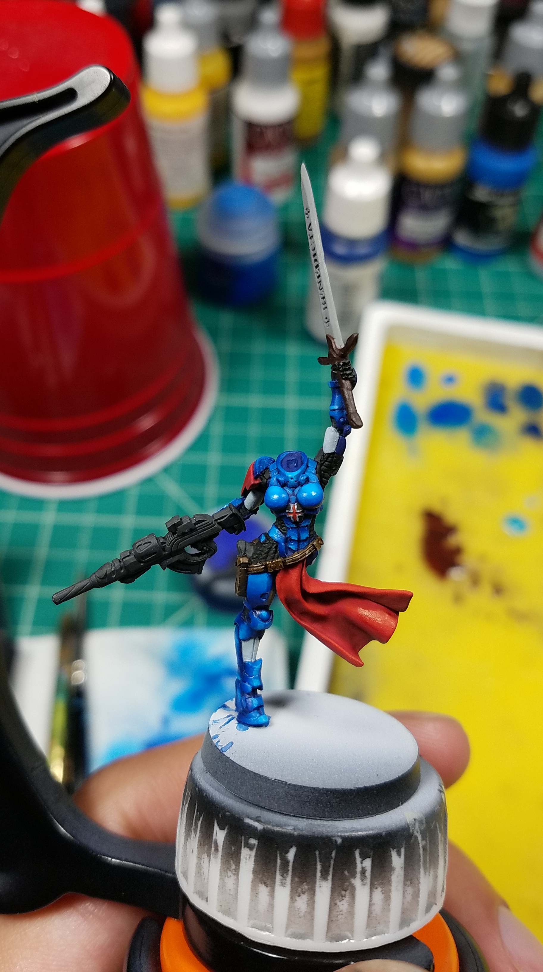 The majority of my time was spent blending the blue on the armor. I had already put down a basecoat of VMC Dark Prussian blue but I didn’t have a plan on how to highlight up from there. So I did some tests using my spare Joan figure using a variety of blues from different brands. I eventually landed on using Scale 75 Mediterranean Blue with a highlight of Mediterranean Blue mixed with white.