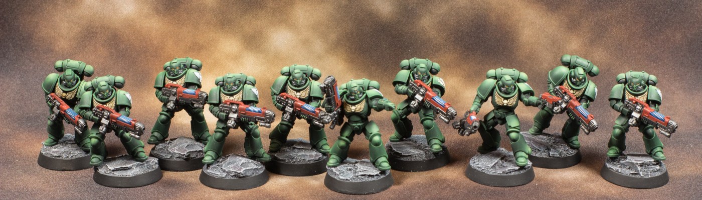 I did not put a lot of effort into edge highlighting the armor or the gun, so the models don’t really pop the way my others do. Also, if you look closely some of the Hellblasters are at slightly weird angles on their bases because I couldn’t be bothered to find a better position for them. Probably the only thing I enjoyed doing was the tiny NMM I did on the sword emblem on the Sergeant.