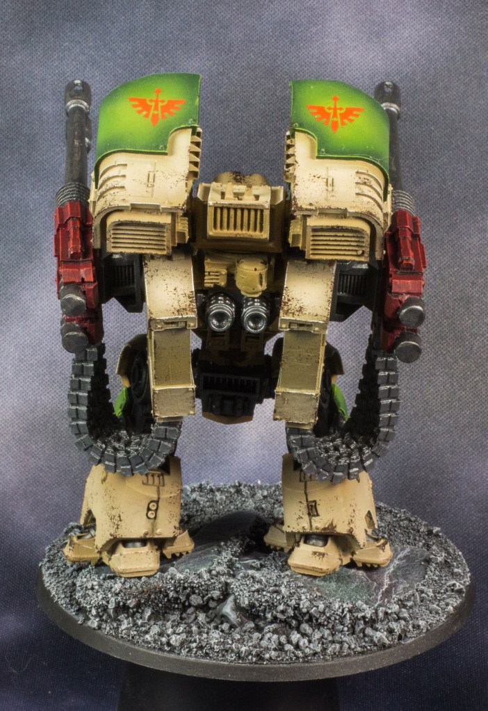 So shortly before I finished the Invictor I completed my first Forgeword unit, the Deredeo Dreadnought with Anvilus Autocannon and Aiolos Missile Launcher (that’s a lot of dakka). This project was interesting because I decided to paint this unit in the colors of the Deathwing which is a paint scheme consisting of a bone colored armor with green accents and also something I have never done before.