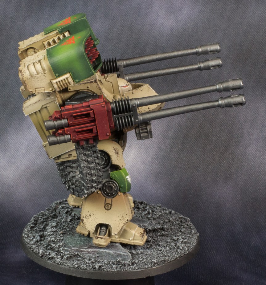 Honestly, the dreadnought ended looking better than I expected considering I haven’t done bone armor before. The targeting lens on the missile launcher looks silly and I definitely need to redo it but today is not that today…tomorrow doesn’t look good either. The weathering really did a good job of breaking up the armor and I might just weather all of my bone armor units from now on because it was just so easy and it produced such a good effect. For future weathering I might take it a step further and use some enamel weathering paints I have from AK Interactive or delve deeper into oil washes. Regardless the Deredeo is finished and I’m happy with how it looks…….but I am going to paint the next one green despite what anyone in my Warhammer group says because that is just a more fun color to paint.