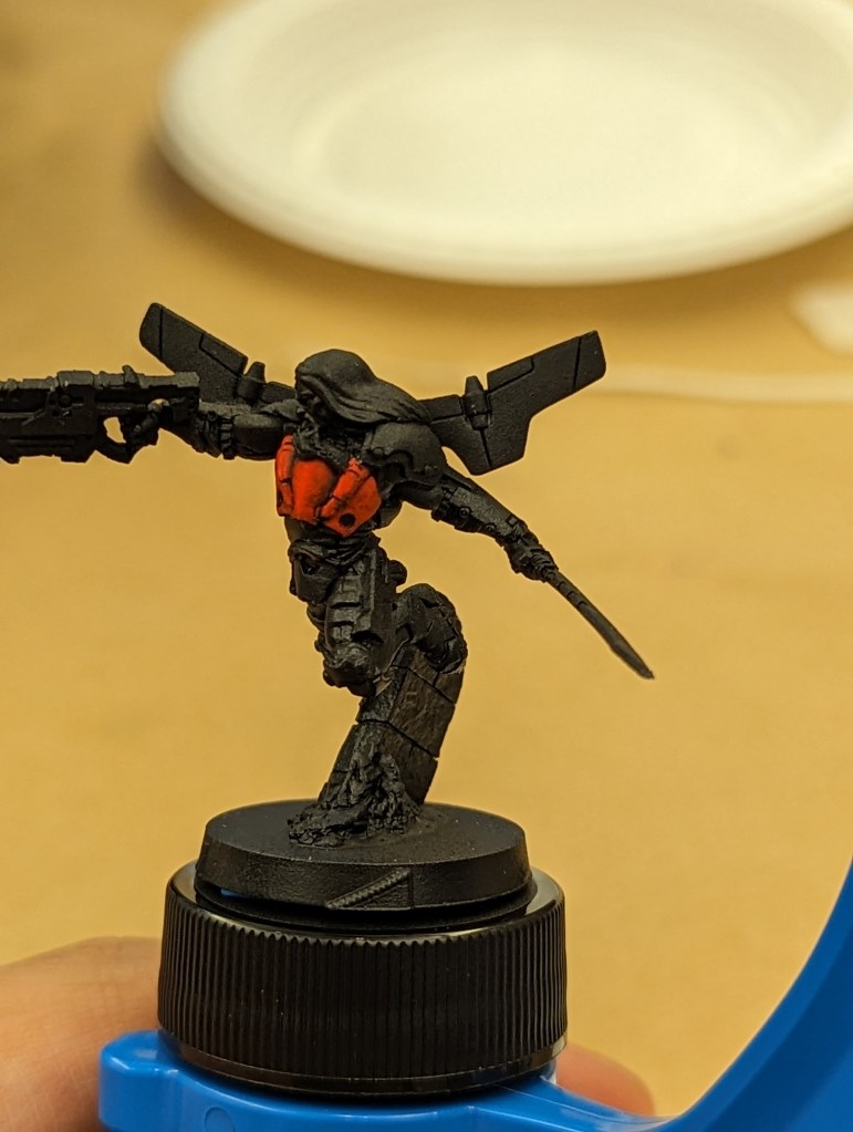 Another thing he taught was a way to get more vibrant reds and yellows on the model without mixing in other colors. It was done by laying down a layer of pure white on the model first and then painting over that with the red; since red was naturally a very transparent color the white undercoat helped maintain the vibrancy it would have otherwise lost when painted over any other color. It’s a technique I had seen done by Flameon miniatures but being able to see it in person and do it right then and there helped cement the idea in my head. One of the last things Steven Garcia went over was a simple NMM on the sword. I didn’t get too much out of this as I was already pretty familiar with this concept. Overall it was a fun class and I definitely intend on incorporating the reference photos idea into my workflow