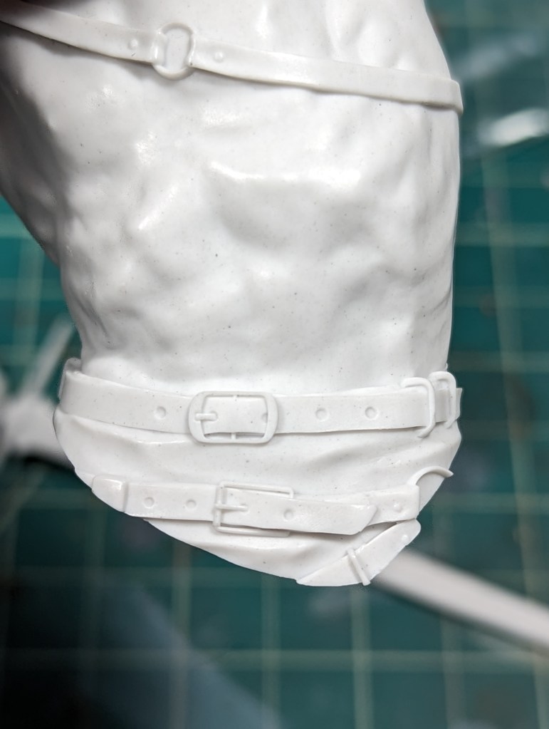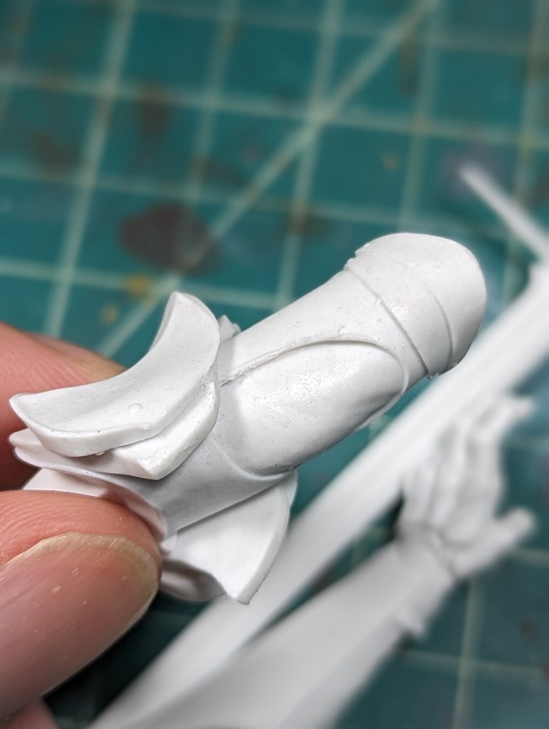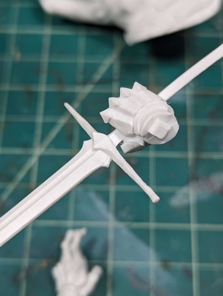 Looking to the sword and armored parts is where we can see some minor flaws and blemishes in the cast. The right arm vambrace and the flared area of the sword just above the guard exhibit a little bit of a mold slip; the sword is easy to fix the vambrace has it along the edge of the armor and thus will require some very careful sanding lest I damage the strap piece, the arm or the rivet. The left arm vambrace has a noticeable but small bubble on the edge of the hand section that will require some particularly deft filling work that will be difficult to blend in due to it’s location. And lastly the right upper arm piece has a flared lip on the armor around the bicep that isn’t entirely complete. The upper edge of that particular detail seems to not have been fully casted and honestly I might just sand it smooth so that it’s not noticeable rather than try to rebuild it.