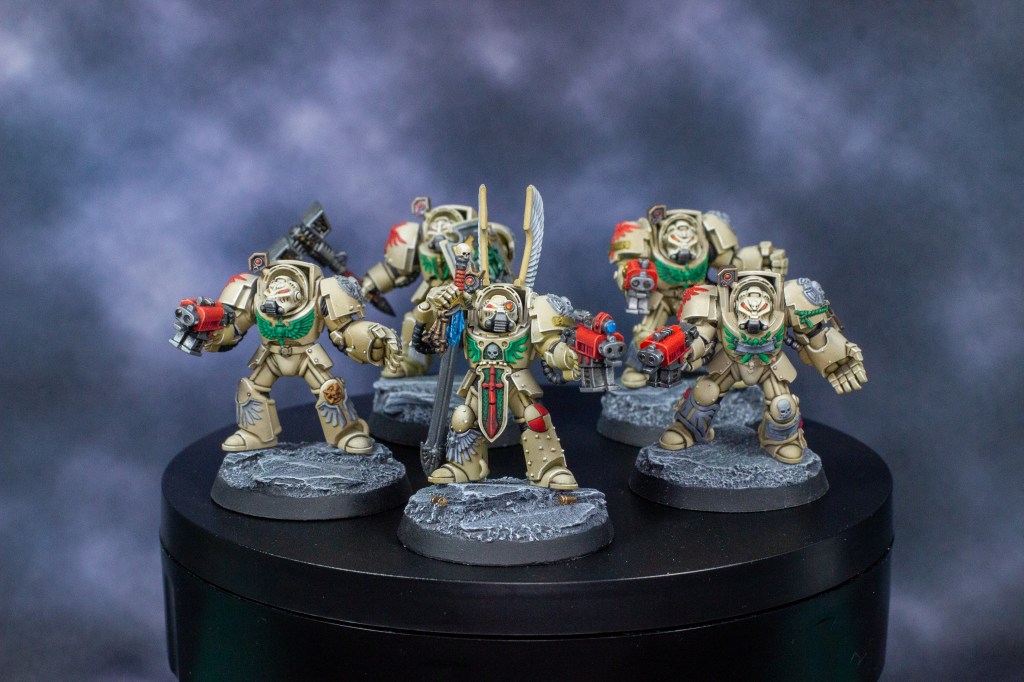 In my every present journey to get back into the swing of things, I am trying to finish projects I had on my desk already. The first being a squad of Deathwing Terminators I started almost a year ago at this point, back when they were actually competitively viable.